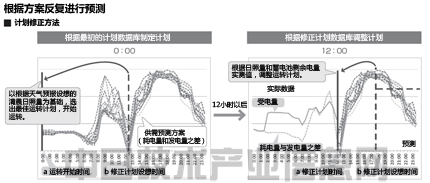 一天內(nèi)可多次通過這種優(yōu)化模擬進(jìn)行修正控制。首先,根據(jù)天氣預(yù)報設(shè)想清晨的日照量,以此為基礎(chǔ)設(shè)定最佳運(yùn)轉(zhuǎn)計劃,并開始運(yùn)轉(zhuǎn)。事先確定修正計劃的時間。從開始運(yùn)轉(zhuǎn)的時間到預(yù)定修正計劃的時間,根據(jù)這段時間內(nèi)的狀況變化,事先制定多個可供選擇的運(yùn)轉(zhuǎn)計劃方案。等到了修正計劃的時間,則根據(jù)這時的日照量及蓄電池的剩余電量,選出最佳運(yùn)轉(zhuǎn)計劃方案。此時還將設(shè)定下次修正計劃的時間,制定下一個運(yùn)轉(zhuǎn)計劃方案。通過多次調(diào)整計劃,以取得最大運(yùn)用效果。