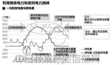 在太陽能發(fā)電量較多、電力有剩余時,將電能存儲在蓄電池中,在電力不足時加以利用。并且,在預(yù)計會出現(xiàn)陰天及下雨天時,事先利用電價較低的夜間電力蓄電,在白天電力需求較大時加以利用。
