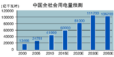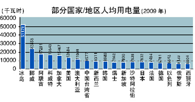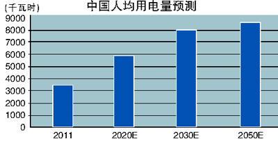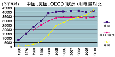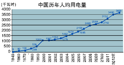 2011年,我國(guó)全社會(huì)用電量4.7萬(wàn)億度,超過(guò)美國(guó),排名世界第一。2011年,我國(guó)人均用電量3490度,比世界平均水平高約450度,排名世界第五十五位左右。過(guò)去十年,我國(guó)人均用電量?jī)粼?340度。