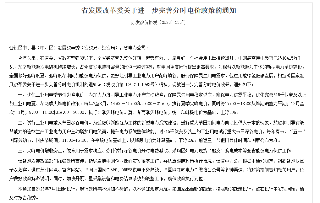 對江蘇省來說,高峰時段8:00-11:00、17:00-22:00,平期時段11:00-17:00、22:00-24:00,低谷時段0:00-8:00。7月到8月,上午10:00-11:00和下午2:00-3:00執(zhí)行夏季尖峰電價,同時將下午5:00-6:00從峰期調(diào)整為平期。12月到次年1月,上午9:00-11:00和下午6:00-8:00執(zhí)行冬季尖峰電價。