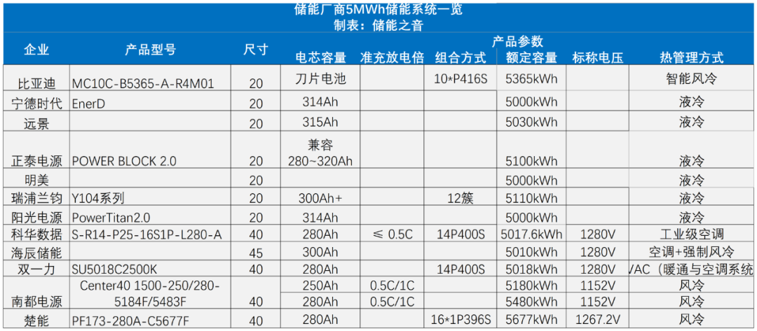 目前,推出5MWh系統(tǒng)的廠商如下(含部分40尺儲能系統(tǒng)):