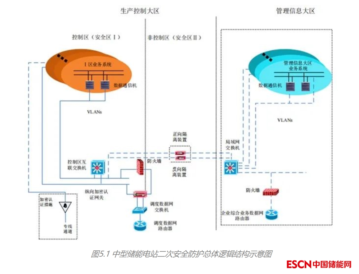 大型儲能電站及中型儲能電站二次安防系統(tǒng)均配置生產(chǎn)控制大區(qū)與管理信息大區(qū),且安全區(qū)內(nèi)及各安全區(qū)之間互聯(lián)設(shè)備功能相同,區(qū)別在于大型儲能電站的生產(chǎn)控制大區(qū)設(shè)置控制區(qū)和非控制區(qū),而中型儲能電站的生產(chǎn)控制大區(qū)僅設(shè)置控制區(qū),不另設(shè)置非控制區(qū)。