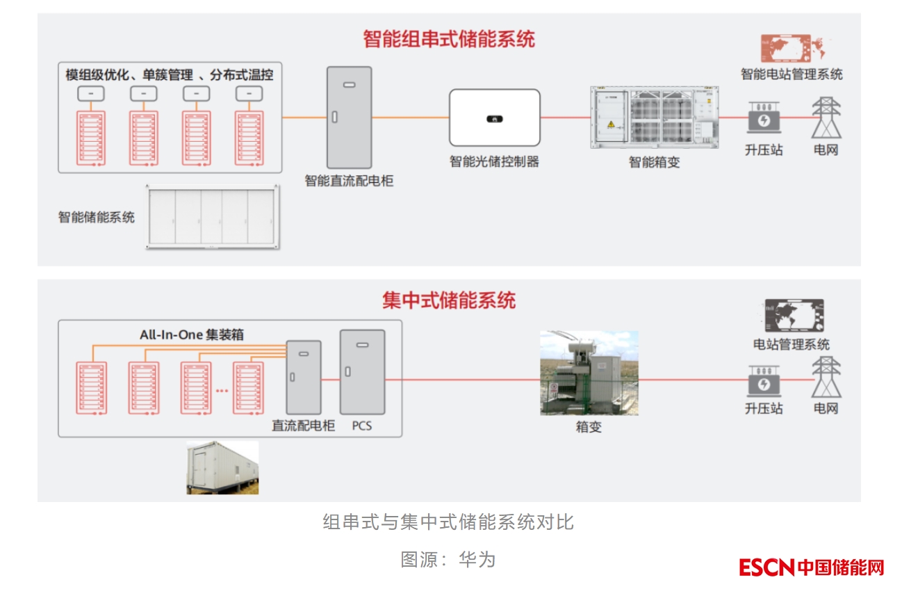 目前業(yè)內(nèi)電池儲(chǔ)能系統(tǒng)主要采取集中式,多組電池并聯(lián)將引起電池簇之間的不均衡;組串式可以實(shí)現(xiàn)簇級(jí)管理,提升系統(tǒng)壽命,提高全壽命周期放電容量。比如華為提出“一包一優(yōu)化、一簇一管理”的智能組串式方案,解決集中式系統(tǒng)電池容量衰減、一致性偏差、容量失配等問(wèn)題。組串式系統(tǒng)規(guī)?;瘧?yīng)用趨勢(shì)已見(jiàn)雛形,比如華能黃臺(tái)100MW/200MWh項(xiàng)目,是國(guó)內(nèi)首個(gè)采用組串式PCS架構(gòu)的大型儲(chǔ)能電站(PCS由上能電氣提供);山東德州林洋光儲(chǔ)3MW/6MWh項(xiàng)目也采用該系統(tǒng)架構(gòu)(華為提供整套系統(tǒng))。