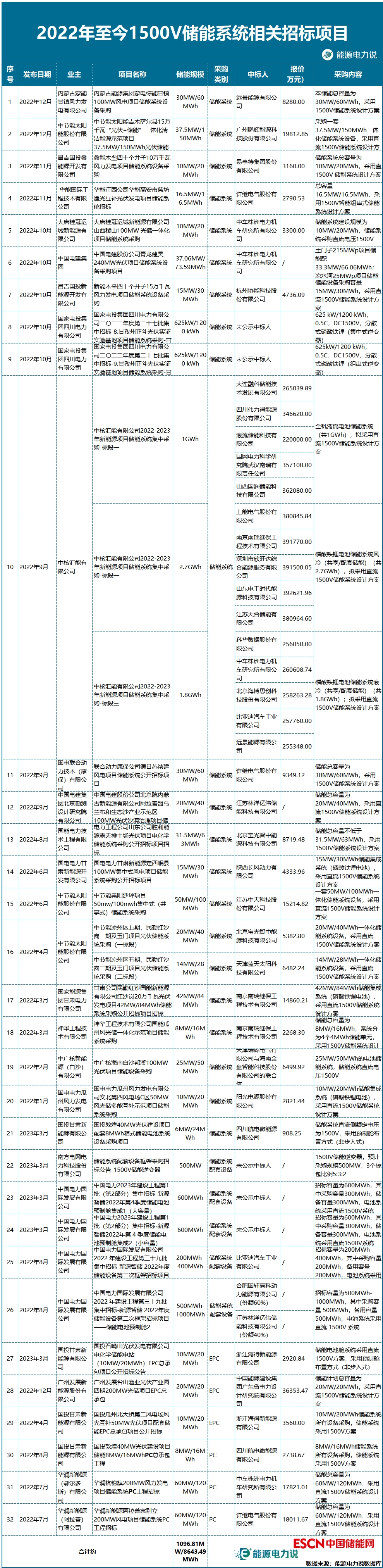 據(jù)不完全統(tǒng)計(jì),2022年以來(lái), 采用1500V儲(chǔ)能系統(tǒng)的招標(biāo)項(xiàng)目超9GWh,其中“中核匯能有限公司2022-2023年新能源項(xiàng)目?jī)?chǔ)能系統(tǒng)集中采購(gòu)項(xiàng)目”,采購(gòu)全釩液流及磷酸鐵鋰電池儲(chǔ)能系統(tǒng)總規(guī)模達(dá)5.5GWh,明確項(xiàng)目擬采用直流1500V儲(chǔ)能系統(tǒng)設(shè)計(jì)方案。從近期招標(biāo)項(xiàng)目數(shù)量來(lái)看,1500V儲(chǔ)能系統(tǒng)已成為各發(fā)電集團(tuán)主流儲(chǔ)能系統(tǒng)電壓等級(jí)。