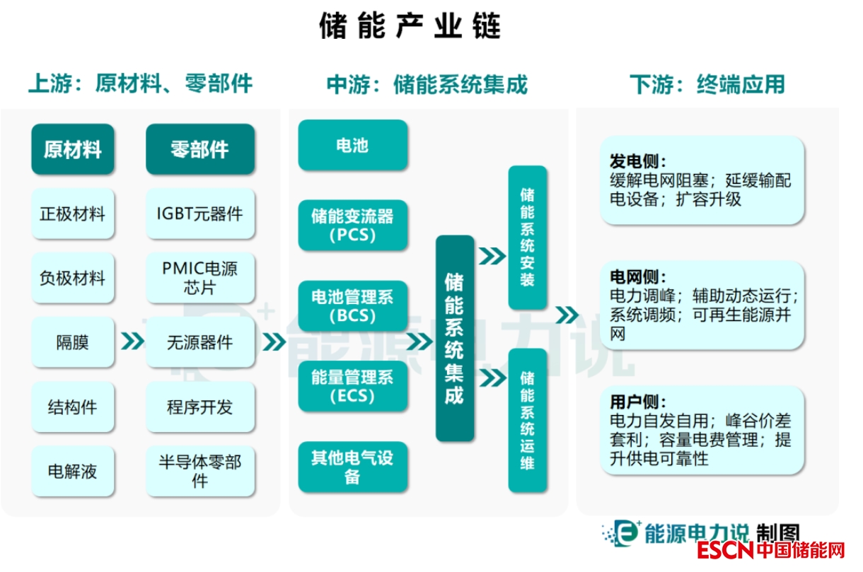 儲(chǔ)能產(chǎn)業(yè)鏈整體圍繞電池開(kāi)展,主要包括上游原材料及零部件的供應(yīng)商,中游核心環(huán)節(jié)儲(chǔ)能系統(tǒng)集成,含電池組、儲(chǔ)能變流器(PCS)、電池管理系統(tǒng)(BMS)、能量管理系統(tǒng)(EMS)四大關(guān)鍵部分以及其他設(shè)備,主要應(yīng)用在發(fā)電側(cè)、電網(wǎng)側(cè)、用戶側(cè)和微電網(wǎng)四大領(lǐng)域,其中發(fā)電側(cè)受益于新能源產(chǎn)業(yè)發(fā)展帶動(dòng),是推動(dòng)儲(chǔ)能市場(chǎng)的主要?jiǎng)恿Α?