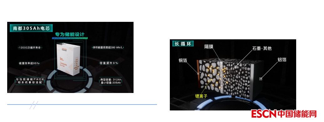 通過技術創(chuàng)新,南都305Ah儲能專用電池擁有20年超長壽命,體積能量密度超過380Wh/L,循環(huán)壽命可達12000次,能量效率超95%。