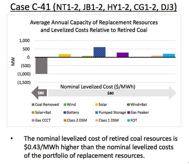 在Pacificorp公司研究的10種不同方案中,唯一不需要額外儲(chǔ)能的方案是只關(guān)閉兩個(gè)煤炭發(fā)電廠。C-41方案是最激進(jìn)的方案,計(jì)劃提前關(guān)閉9個(gè)煤炭發(fā)電廠,這需要部署裝機(jī)容量大約600MW獨(dú)立儲(chǔ)能系統(tǒng)。