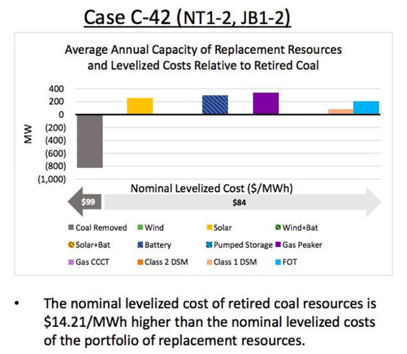 但在PacifiCorp公司的綜合能源規(guī)劃(IRP)分析概述的大多數(shù)煤炭發(fā)電廠關(guān)閉的情況下,儲(chǔ)能系統(tǒng)將發(fā)揮重要作用。例如,根據(jù)下圖所示,“C-42”方案——其中包括關(guān)閉四個(gè)煤炭發(fā)電廠和Pacificorp公司強(qiáng)調(diào)的2.48億美元的節(jié)省成本,這需要部署裝機(jī)容量約300MW儲(chǔ)能系統(tǒng),以及裝機(jī)容量200MW以上的太陽能發(fā)電設(shè)施,以及近400MW天然氣發(fā)電設(shè)施。
