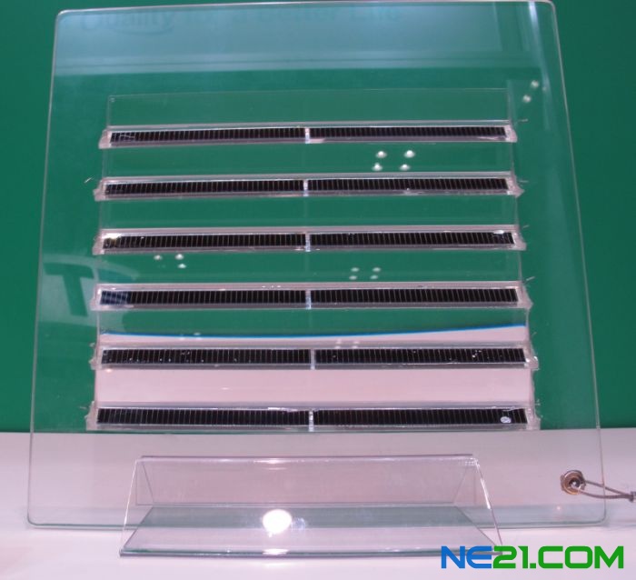 該太陽能電池模塊的制作原理是在棱鏡的一面粘貼太陽能電池單元,然后將其粘貼在透明的基板上。而此次采用的太陽能電池則是對其他公司的結(jié)晶硅型太陽能電池進(jìn)行細(xì)致切割而成的。
