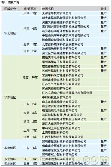 隨著鋰離子電池產(chǎn)業(yè)的快速發(fā)展,我國(guó)鋰電池隔膜產(chǎn)量逐漸增長(zhǎng)。由于利潤(rùn)率較高,大概在20%左右,吸引了越來(lái)越多的企業(yè)進(jìn)入鋰離子電池隔膜領(lǐng)域。據(jù)高工鋰電產(chǎn)業(yè)研究所(GBII)統(tǒng)計(jì),國(guó)內(nèi)共有35家隔膜生產(chǎn)廠商,其中18家已經(jīng)量產(chǎn),占總數(shù)的51.43%。從區(qū)域劃分的角度來(lái)看,華東地區(qū)共有1 9家廠商,占總數(shù)的54%;華北地區(qū)共有10家廠商,占總數(shù)的29%;華南地區(qū)共有4家廠商,占總數(shù)的11%;東北和西北地區(qū)分別有1家廠商。珠三角、長(zhǎng)三角和華北地區(qū)實(shí)現(xiàn)規(guī)模產(chǎn)業(yè)化的企業(yè)數(shù)量較為集中,結(jié)合鋰電池終端產(chǎn)品企業(yè)的地域分布,未來(lái)鋰電池隔膜行業(yè)有望在上述三個(gè)地區(qū)形成產(chǎn)業(yè)集群。具體隔膜企業(yè)名稱(chēng)如表1所示。