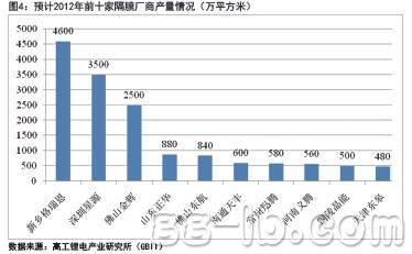 根據(jù)高工鋰電產(chǎn)業(yè)研究所(GBII)統(tǒng)計(jì)數(shù)據(jù)顯示,從產(chǎn)量規(guī)模上看,新鄉(xiāng)格瑞恩、深圳星源和佛山金輝仍處于國(guó)產(chǎn)隔膜廠商的第一階梯,預(yù)計(jì)2012年產(chǎn)量分別為4600萬(wàn)m2、3500萬(wàn)m2和2500萬(wàn)m2;南通天豐、山東正華、佛山東航和河南義騰等處于第二階梯。前十位隔膜廠商產(chǎn)量情況如圖4所示。