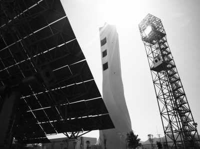 一進入電站,記者首先被眼前一個造型優(yōu)雅的龐然大物所吸引,這是個白色的六邊形柱體,朝北一側(cè)靠近頂端的位置留有三個“窗口”。“這叫太陽塔,也叫集熱塔,它高120米,那三個窗口將用來安裝集熱器。”電站站長馬廣成告訴記者,“之所以留三個窗口,是因為我們電站是實驗電站,可以通過裝不同的集熱器,以測試其性能特點,從而選擇更適合的集熱器技術(shù)。”