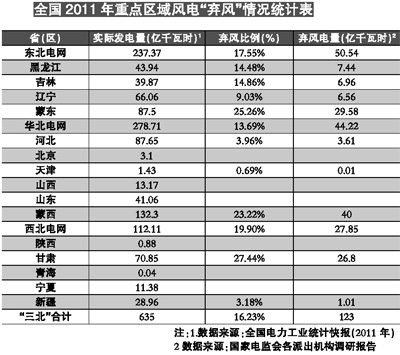 “三北”地區(qū)包括國家規(guī)劃的6個(gè)以陸地風(fēng)電為主的千萬千瓦級風(fēng)電基地,并網(wǎng)風(fēng)電裝機(jī)占全國并網(wǎng)風(fēng)電裝機(jī)比重達(dá)87.7%。2011年,全國風(fēng)電發(fā)電量為731.74億千瓦時(shí),其中“三北”地區(qū)風(fēng)電發(fā)電量為635.37億千瓦時(shí),占比為86.8%。但2011年,“三北”地區(qū)風(fēng)電場平均利用小時(shí)數(shù)1907小時(shí),同比降低266小時(shí);棄風(fēng)電量達(dá)123億千瓦時(shí),棄風(fēng)率約16%,電費(fèi)損失約66億元。