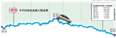 而在二級市場上,比亞迪7月份的股價從19.86元一路降至7月底的14.2元,股價下跌了28.5%。