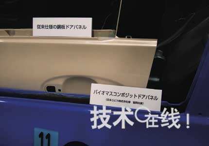 日本杰斯比(JSP)和優(yōu)必佳(U-PICA)展出了采用經(jīng)過玻璃纖維強(qiáng)化處理的植物性樹脂(植物性FRP)和植物性發(fā)泡芯材相結(jié)合的“復(fù)合板”制成的汽車車門板(圖2)。包含玻璃窗在內(nèi),這種復(fù)合板車門約重21kg,比約28kg的鋼板車門輕7kg。還有望提高隔熱性、吸音性及沖擊吸收性等性能。