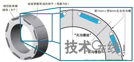 轉(zhuǎn)子為8極,轉(zhuǎn)子上插入了8個(gè)這種磁鐵。如果第1極沒有溝槽,則第3、5、7極也沒有溝槽,而在第2、4、6、8極設(shè)有溝槽。具體而言,就是在轉(zhuǎn)子外周上正好相當(dāng)于磁鐵兩端附近之處,加工深1mm×寬5mm左右的小溝槽。因此,各個(gè)“有溝槽極”上分別設(shè)有兩個(gè)溝槽。