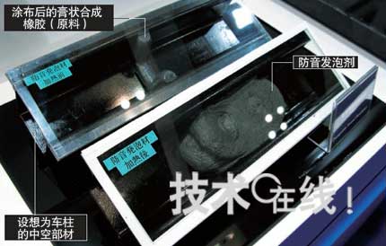 | 圖4:涂布型防音發(fā)泡劑“Penguin Form”(盛勢(shì)達(dá)技研) 將含有發(fā)泡劑的膏狀合成橡膠填入車柱中,通過加熱使其發(fā)泡。這樣,車輛行駛時(shí)的風(fēng)切音等噪音就不易傳入車內(nèi)。照片遠(yuǎn)處為發(fā)泡前的狀態(tài),近處為發(fā)泡后的狀態(tài)。 |