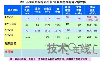 | 表1 不同孔結(jié)構(gòu)的多孔碳/硫復(fù)合材料的電化學(xué)性能 |