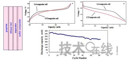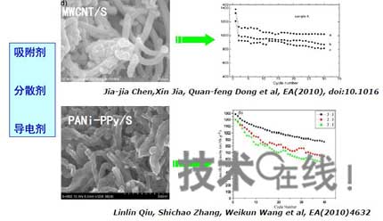 中國防化研究院的王維坤博士在9月16日于上海復(fù)旦大學(xué)舉行的“未來電動汽車高能電源研討會”上表示,大介孔碳可通過充填單質(zhì)硫形成寄生型碳硫復(fù)合物。利用碳的高孔容(>1.5cm3/g),保證硫的高填充量,實現(xiàn)高容量;利用碳的高表面密度(>500cm2/g)吸附放電產(chǎn)物,提高循環(huán)穩(wěn)定性;利用碳的高導(dǎo)電性(幾S/cm)改善單質(zhì)硫的電絕緣性,提高硫的利用率和電池的充放電倍率性能。