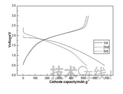 充電電壓及容量會隨著電流密度的增加而下降。在電流密度為55.6mA/g時, 容量為792mAh/g;電流密度為667mA/g時,容量為604 mAh/g。這表明該種電池可工作在電流密度較高的狀態(tài)下。