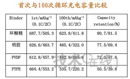 采用環(huán)糊精作電極粘合劑,因為其無論在小電流還是大電流倍率下,都具有最好的循環(huán)性能。圖8和表3是幾種電極粘合劑對電池性能影響的比較。(記者 恩平)