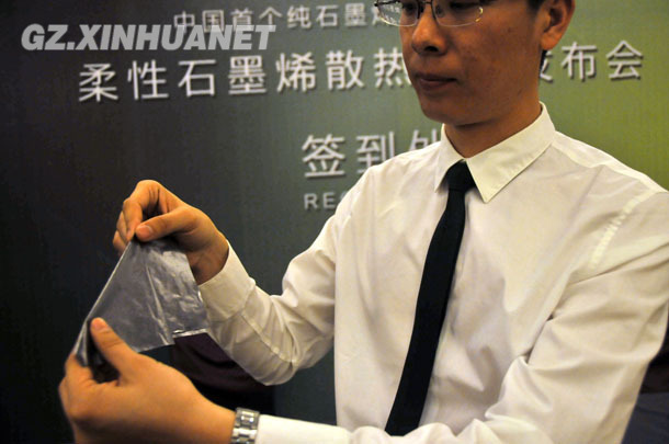 貴州新碳高科公司技術(shù)總監(jiān)王恭凱博士展示其公司研發(fā)的柔性石墨烯散熱薄膜(4月2日攝)