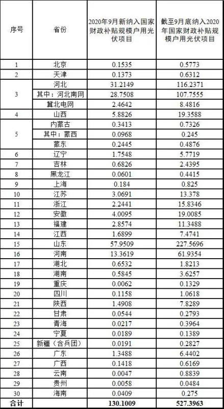 根據(jù)各省級(jí)能源主管部門、電網(wǎng)企業(yè)報(bào)送信息,經(jīng)國(guó)家可再生能源信息管理中心梳理統(tǒng)計(jì),2020年9月新納入國(guó)家財(cái)政補(bǔ)貼規(guī)模戶用光伏項(xiàng)目總裝機(jī)容量為130.1萬千瓦。截至2020年9月底,全國(guó)累計(jì)納入2020年國(guó)家財(cái)政補(bǔ)貼規(guī)模戶用光伏項(xiàng)目裝機(jī)容量為527.4萬千瓦。詳細(xì)情況見附表。