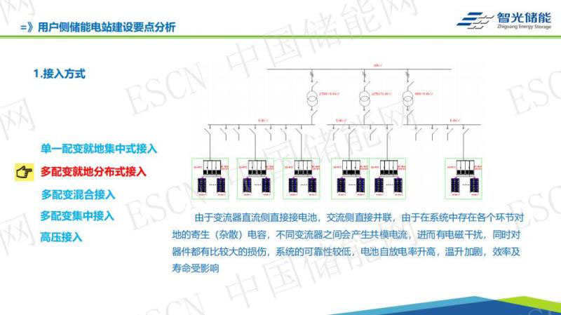 第一個是接入方法,接入方法很常規(guī),做電力系統(tǒng)一般會想到一個客戶一臺變壓器配一套儲能系統(tǒng)比較簡單,就地集中接入,一臺配變這種效果非常好的,因為是建在配變的下端,不存在容量的影響??墒峭覀兘佑|到的客戶是有多臺配電的,往往是直接并聯(lián)接入,這就存在一個問題:大量的電力電子儲能PCS直接并聯(lián)接入,由于交流側(cè)直接并聯(lián),系統(tǒng)中各個環(huán)節(jié)存在雜散的電容(共模電容),進(jìn)而有電磁干擾,會對電池壽命、效率和PCS及儲能系統(tǒng)的穩(wěn)定性造成很大的影響,這種方式還是要慎重考慮,因為儲能系統(tǒng)的穩(wěn)定性跟投資收益密切相關(guān)的。