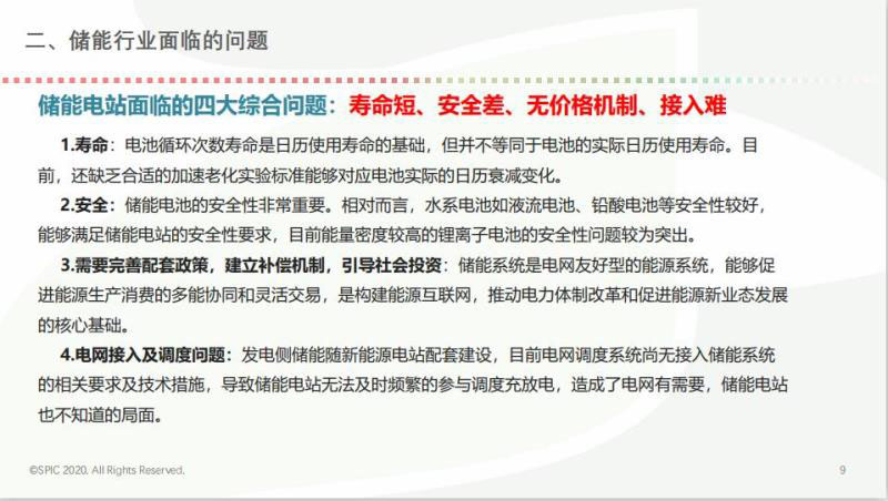 首先,一個(gè)方面還是儲(chǔ)能技術(shù)本身的一些問(wèn)題,我們認(rèn)為現(xiàn)在儲(chǔ)能技術(shù)一個(gè)是壽命,因?yàn)橹饕闹髁骷夹g(shù)路線(xiàn)還是鋰電池,但是它的壽命,各位經(jīng)常講循環(huán)次數(shù),包括我也知道有很多廠家說(shuō)循環(huán)次數(shù)已經(jīng)到了8000次甚至1萬(wàn)次。但是我們這里更關(guān)注一個(gè)實(shí)際日歷使用壽命,我們認(rèn)為大家說(shuō)的循環(huán)次數(shù)跟實(shí)際的日歷使用壽命不是一個(gè)概念。但實(shí)際上這都是沒(méi)有經(jīng)過(guò)特別多的試驗(yàn)和驗(yàn)證和技術(shù)仿真,尤其是在實(shí)際日歷壽命這一塊需要做加速老化試驗(yàn)或者仿真計(jì)算的,我們覺(jué)得這一塊是需要業(yè)內(nèi)關(guān)注的。