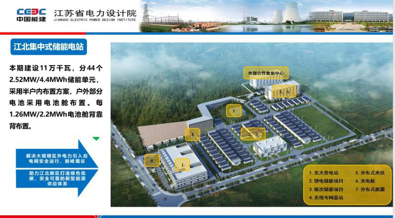 下面我著重講兩個工程實踐的案例,首先是對規(guī)?;惺絻δ埽@個案例是位于南京江北高新開發(fā)區(qū),它的立項基本目標(biāo),一個是解決大規(guī)模區(qū)外來電之后電網(wǎng)的安全運行,實現(xiàn)電網(wǎng)的削峰平。第二個,江北新區(qū)打造綠色低碳的電網(wǎng)體系。這張圖是江北儲能站的平面布置圖,不單純是電化學(xué)的儲能站,應(yīng)該是多站融合的綜合性站點。其中包括在中心區(qū)域的磷酸鐵鋰集中式儲能站,還有系統(tǒng)變電站,在西北側(cè)有一個規(guī)劃的對外的數(shù)據(jù)中心,在整個站區(qū)建筑的頂面以及集裝箱的頂面布置了分布式光伏,以及一些電動汽車充電樁等等。整個站的規(guī)模也比較大,總體是分成44個單元,其中2個集裝箱背靠背組成一個單元。