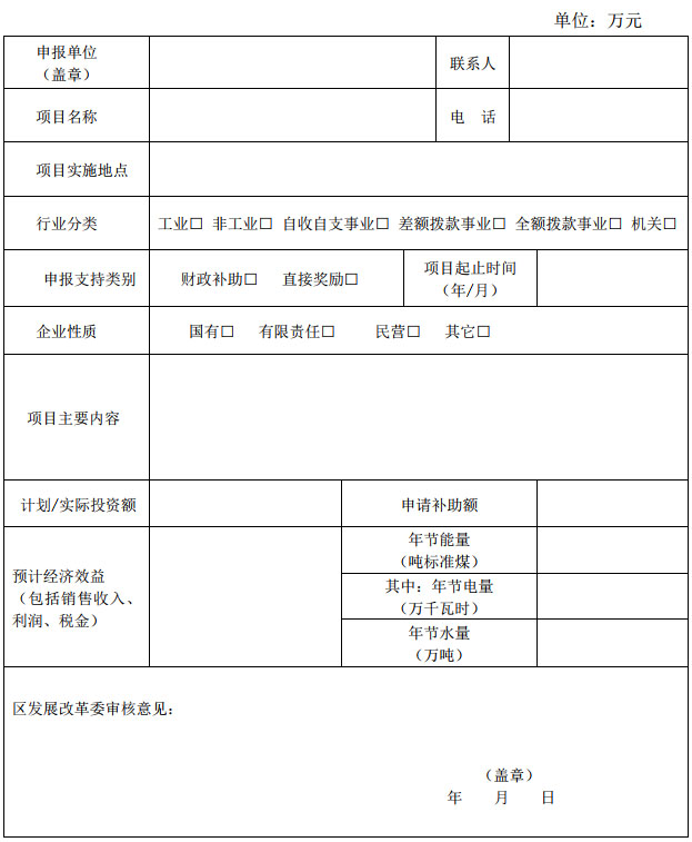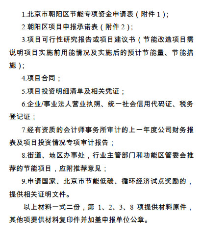 (三)申報單位根據(jù)項目實施情況按時申報,并按照本辦法,如實填報《北京市朝陽區(qū)節(jié)能專項資金申請表》(附件1)、《朝陽區(qū)節(jié)能項目承諾表》(附件2),提交相關(guān)申報材料(附件3),并對材料真實性負(fù)責(zé)。項目單位可直接向區(qū)發(fā)展改革委申報,也可由所在街鄉(xiāng)、行業(yè)主管部門、功能區(qū)管委會推薦申報。