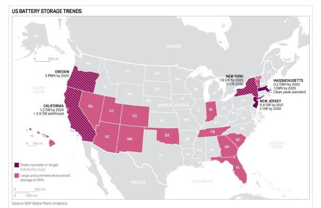 2018年,美國新澤西州、馬薩諸塞州、紐約州發(fā)布了對儲能部署的支持政策,而紐約州于2019年推出了針對各種規(guī)模儲能系統(tǒng)的2.8億美元財務激勵計劃。
