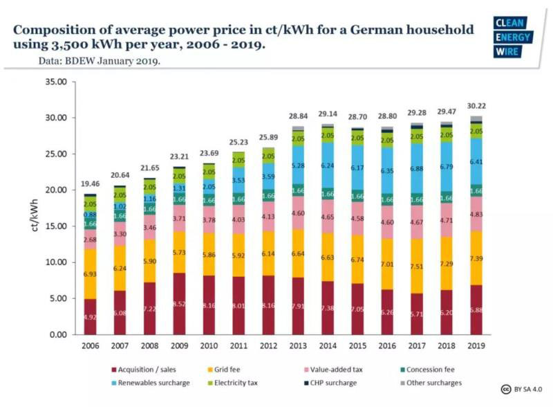 根據(jù)德國能源和水業(yè)協(xié)會(huì)(BDEW)的數(shù)據(jù),2019年德國三人的普通家庭平均每年耗電3,500千瓦時(shí),每月電費(fèi)為88.1歐元(約合人民幣690元)。這個(gè)電費(fèi)的 名義價(jià)格比1998年高出約77%,但如果按通貨膨脹調(diào)整則增幅為33%。德國家庭電費(fèi)增長的最主要原因是可再生能源附加費(fèi)的引入。