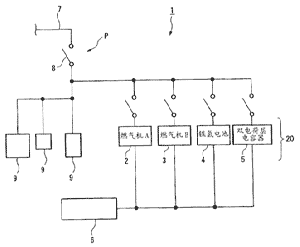 1.微電網系統(tǒng);2.燃氣機(gas engine)A(電源);3.燃氣機B(電源);4.鎳氫電池(電源);5.雙電荷層電容器(電源);6.控制部件;7.商用系統(tǒng);8.設置開關;9.負荷;10.各個分布式電源。