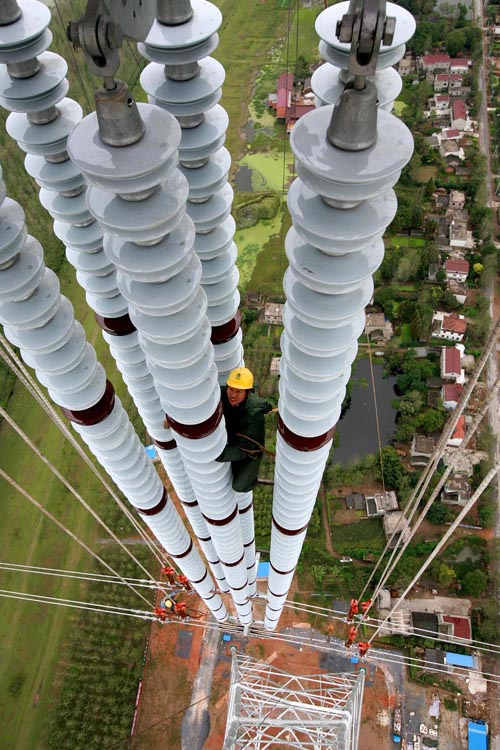 施工人員在240米的高空安裝特高壓絕緣子