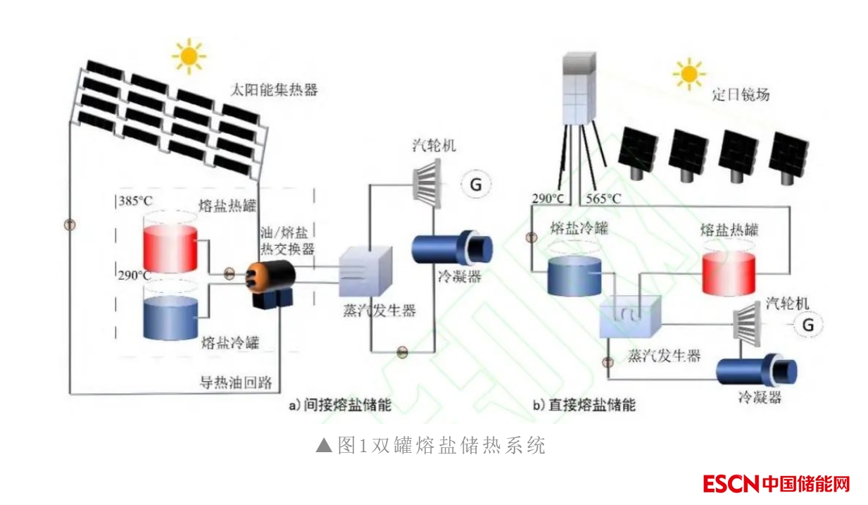 光熱與熔鹽耦合的2種形式在工程中均有應(yīng)用。熔鹽間接蓄熱一般能保持較高的循環(huán)效率,比蒸汽蓄能成本更低,如西班牙Andasol槽式光熱電站是第一個(gè)大規(guī)模熔鹽間接蓄熱電站,容量約為1000MWh,儲(chǔ)能時(shí)間為7.5h。熔鹽直接蓄熱簡(jiǎn)化了電站設(shè)備組成,后期運(yùn)維便捷。典型的熔鹽直接蓄熱電站是美國(guó)Solar two項(xiàng)目,該項(xiàng)目使用的硝酸鹽混合鹽被稱(chēng)作Solar鹽,溫度范圍290~565℃。此后的塔式熔鹽光熱電站多沿用直接蓄熱方式與此工作溫度區(qū)間,如西班牙Gemasolar電廠、青海中控德令哈10MW項(xiàng)目。