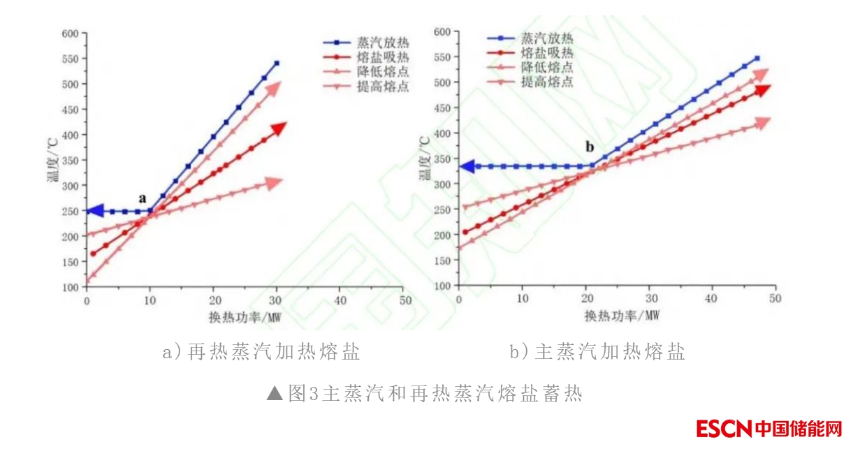 由圖3a)可見(jiàn),由于點(diǎn)a處夾點(diǎn)溫度的存在,熔鹽被加熱的溫度受到熔鹽最低使用溫度和夾點(diǎn)溫度的限制,其使用溫度范圍有限。常見(jiàn)的低熔點(diǎn)熔鹽使用溫度范圍為140~450℃,受到夾點(diǎn)溫度影響,其最高溫度僅能被加熱至400℃左右。若降低熔點(diǎn),選擇熔點(diǎn)在100℃左右的熔鹽,其使用溫度上限就可以提升至450℃,但此類(lèi)熔鹽的應(yīng)用研究尚不充分,工程實(shí)際中使用較少。若采用常規(guī)Solar鹽,其使用溫度為260~565℃,此時(shí)熔鹽最低工作溫度已經(jīng)接近飽和蒸汽線,被再熱蒸汽加熱的空間較小,并不適用于該場(chǎng)景。綜上所述,在再熱蒸汽蓄熱的情景下,宜采用熔點(diǎn)較低的熔鹽,其最高使用溫度無(wú)需設(shè)置過(guò)高。
