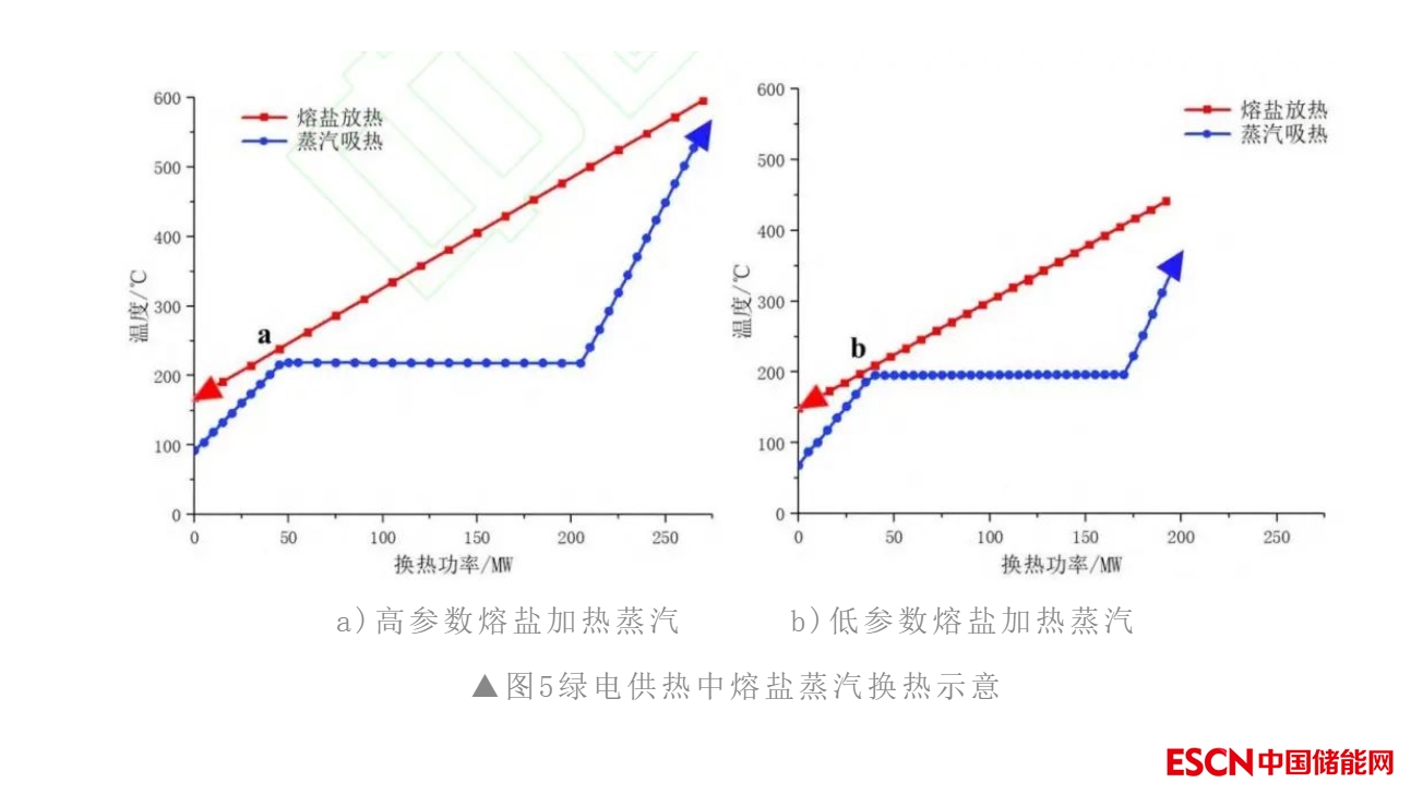 在綠電供熱場(chǎng)景中,由熔鹽加熱蒸汽或過(guò)冷水,應(yīng)根據(jù)不同的情況選擇低參數(shù)或高參數(shù)熔鹽。綠電供熱中熔鹽蒸汽換熱情況如圖5所示。由圖5a)可見(jiàn),蒸汽的升溫受到夾點(diǎn)a的限制,若要輸出超過(guò)500℃的高溫工業(yè)蒸汽,就需要提高熔鹽的蓄熱溫度至約600℃,選用高參數(shù)熔鹽與蒸汽進(jìn)行換熱。在供應(yīng)中低溫工業(yè)蒸汽時(shí),使用熔點(diǎn)較低的硝酸鹽熔鹽即能滿(mǎn)足需求(圖5b)。熔鹽加熱蒸汽的過(guò)程受夾點(diǎn)b溫度限制,最終在低參數(shù)熔鹽工作區(qū)間150~450℃,可供應(yīng)1.2 MPa、370℃的蒸汽。