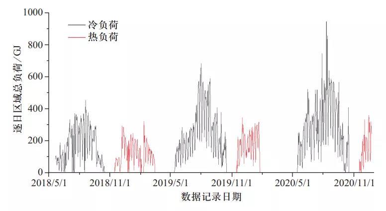 在本項目投產(chǎn)運行后,出于運營管理的需要,能源站利用其機房的節(jié)能控制系統(tǒng)對供能過程中的部分關(guān)鍵數(shù)據(jù)(冷熱水干管的流量、供回水的溫差)進(jìn)行計量。在實際操作中,是由工作人員在每日固定時段執(zhí)行“抄表”操作來實現(xiàn)數(shù)據(jù)計量工作的,記錄從上一個“抄表”時刻到當(dāng)前時刻能源站供給的累計冷熱量,相當(dāng)于記錄了區(qū)域內(nèi)建筑群的逐日總冷熱負(fù)荷。如圖3所示,已記錄數(shù)據(jù)涵蓋了從項目開始投產(chǎn)(2018年5月)至2021年1月的全部供能系統(tǒng)運行日(即系統(tǒng)進(jìn)行檢修的時段除外)的實際冷熱負(fù)荷。