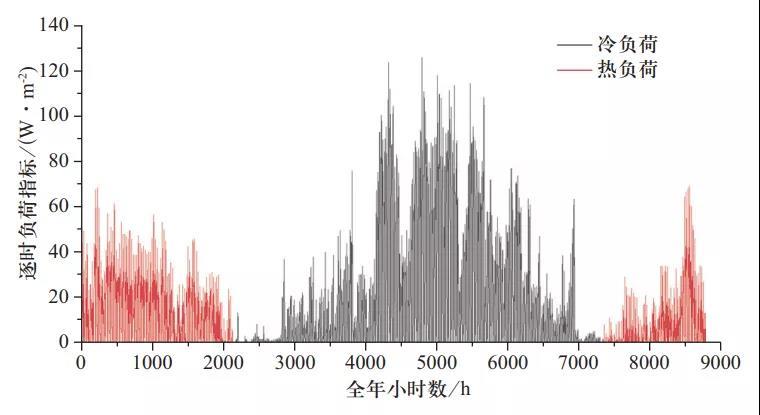 通過在全年尺度上的模擬計算,能夠得到各類型建筑逐小時的單位面積冷熱負(fù)荷指標(biāo)。根據(jù)規(guī)劃階段的實際需求,為本項目中能源站提供了其供能區(qū)域全年的逐時冷熱負(fù)荷指標(biāo)(如圖2所示),并將其總負(fù)荷的峰值作為該區(qū)域供能系統(tǒng)的冷熱負(fù)荷設(shè)計值,用以指導(dǎo)項目建設(shè)中的設(shè)備選型工作。