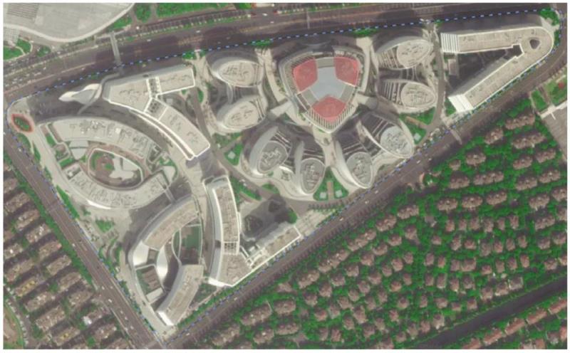 上海西虹橋1號能源站于2018年年初建成并投產(chǎn)。目前,該能源站為其規(guī)劃區(qū)域內(nèi)占地面積約為160 hm2的大型建筑群供能。該項目是集商業(yè)、餐飲、辦公于一體的大型城市綜合體,其中包括了辦公、集中商業(yè)、街區(qū)商業(yè)等在內(nèi)的多棟單體建筑,功能綜合性較強,建筑群衛(wèi)星圖如圖1所示。