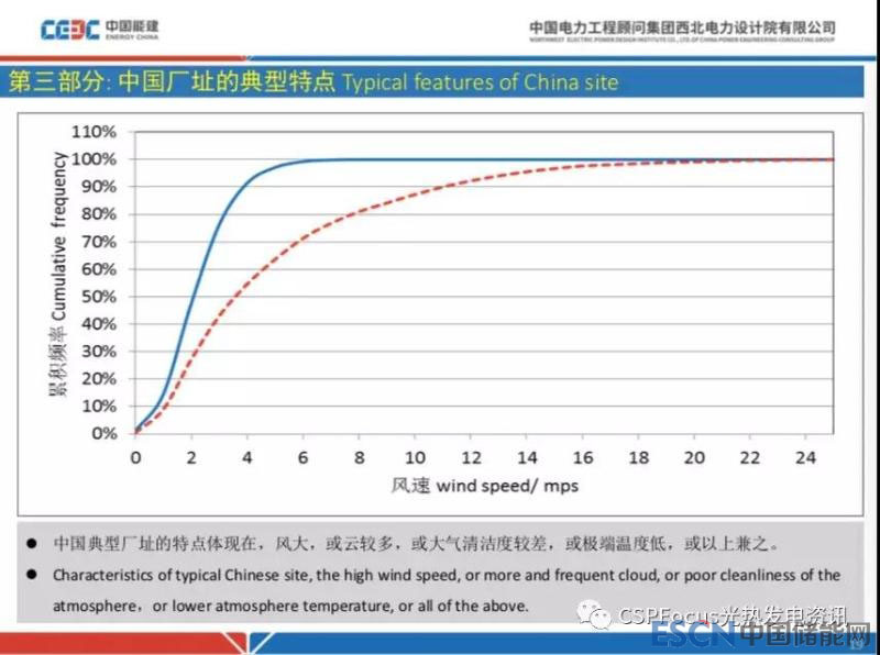 最后再強調一下風的問題,風大的話集熱器設計成本比較高,比如上面這一組曲線,橫坐標是風速,縱坐標是風速累積頻率結果,兩個曲線代表兩個廠址。比如這個電站集熱器要確保99%的風速下都可以工作,如果是紅色間斷線代表的廠址,那么這個地區(qū)風比較大,會發(fā)現(xiàn)集熱器抗風要求比較高,可能到15m/s或者更高,這里的風速是10米高的平均風速,跟外國常說的3s陣風的不太一樣,這里有個既定的轉化關系。而對于藍色實線代表的廠址,累積概率99%時對應的風大部分情況下都是6m/s以內,集熱器前期投資可以控制在比較低的水平。