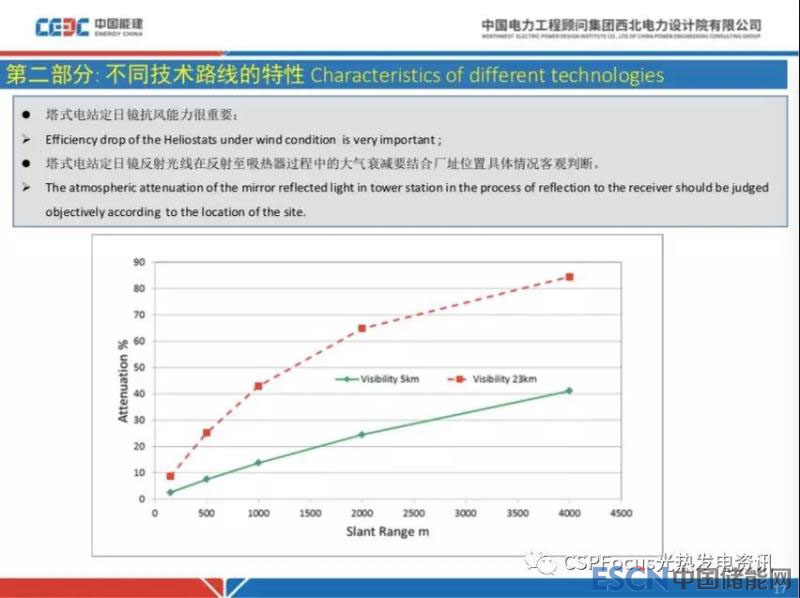 塔式電站有什么需要我們特別關注的問題呢,就是在項目選擇的時候,我想有兩個關鍵因素需要提醒。一個是抗風能力,因為新疆哈密有一些地區(qū)風非常大,塔式電站定日鏡誤差,包括運行中隨著不同的風速,風速越高誤差越大,會非常明顯的增大,導致性能下降。還有一個問題,大氣清潔度問題,比方說這跟實線是5公里的可見度模型和虛線23公里可見度模型,橫坐標是定日鏡距離吸熱器的距離,縱坐標是大氣衰減量,比如說100兆瓦的電站,最遠的定日鏡距離吸熱器可能會到2000米,這里比較清潔的大氣條件模型下,反射鏡到吸熱器能量傳輸過程中,能量損失20%多。更糟糕的情況下是某個廠址某個季節(jié),或者全年空氣臟兮兮的,沙塵霧比較多就會更夸張,當然實際中沒有這么夸張的清潔度,但是還是很重要的一個因素在選址的時候需要重視。日喀則大氣環(huán)境和德令哈、敦煌、玉門都不一樣,選擇的時候也是需要重視。