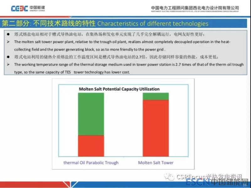 槽式和塔式都采用熔鹽作為儲熱介質,對于槽式電站溫度比較低,假設這根柱子高度代表熔融鹽總共儲能的能力(低溫不是按熔鹽凝固點,是按照朗肯循環(huán)回熱系統(tǒng)決定的,大概290度),紅色代表熔融鹽儲能能力的利用情況,槽式只利用了33%,塔式熔鹽電站利用了90%,我們在393度的槽式電站中采用熔鹽儲鹽,并沒有把熔鹽儲能更充分利用。為什么強度熔鹽這個問題呢?我們知道國內有一些項目,近年熔鹽成本高于前些年廣核德令哈項目招標價30%,對100兆瓦的導熱油電站來說,這部分成本可能在2個多億,這就是一個比較致命的投資了。這么貴的東西要充分利用它才能更好地發(fā)覺其價值。
