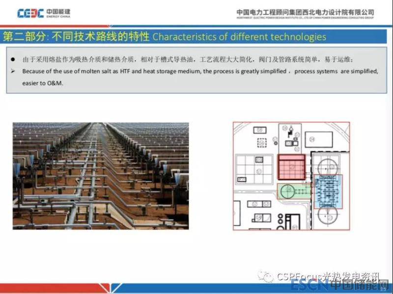這是典型槽式電站的全廠管道工藝照片。想象一下50兆瓦槽式電站集熱管就需要120公里。塔式電站工藝系統(tǒng),包括發(fā)電、水、油鹽等系統(tǒng),布置比較緊湊,主要集中在儲換熱單元,還有儲換熱單元和發(fā)電單元連接之間的管架,以及吸熱塔,這一區(qū)域直徑范圍不過100米左右而已,因此從這個角度來講塔式電站這一塊優(yōu)越性表現(xiàn)良好。同樣的,前面提到槽式熔鹽電站,一個50MW的電站,管道太長,運行階段的防凝成本較高,同時高溫熔鹽管道一般采用奧氏體不銹鋼,這部分投資可能要到上千萬元。