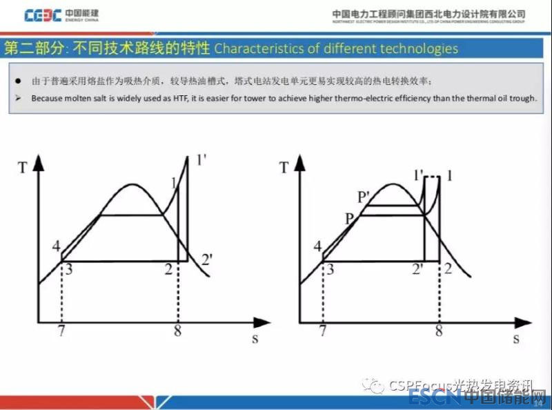 不同技術路線的特性,剛才談了前面光到熱環(huán)節(jié),后面熱到電的環(huán)節(jié)大家都比較清楚。由于普遍采用熔鹽作為吸熱介質,相比較槽式導熱油電站,塔式電站發(fā)電單元更容易實現(xiàn)較高的熱電轉換效率,這是一個典型的朗肯循環(huán)的圖,溫熵圖上面這段曲線右上角的點1和1’越高,做功介質平均吸熱溫度越高,朗肯循環(huán)效率越高,這個很簡單很成熟。同樣的道理,壓力越高右邊這張圖P和P’越高,一樣可實現(xiàn)較高的熱電效率。