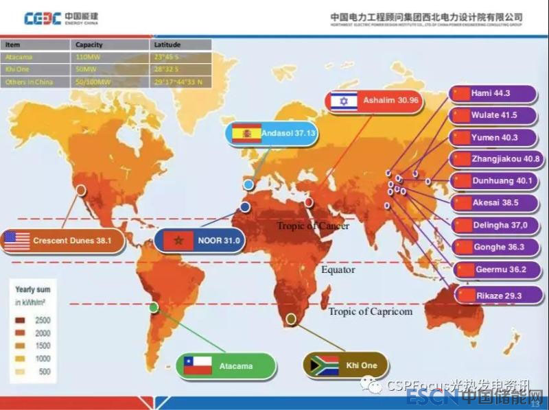 對于塔式電站來講,相對的受緯度高低影響沒有那么明顯。菲涅爾電站緯度高了之后,尤其超過40度之后,下降更高。新疆哈密大概44度,在中國我們需要把重點放在目前這幾個區(qū)域。
