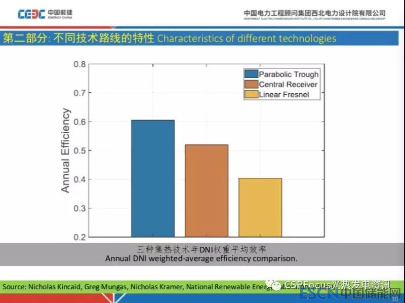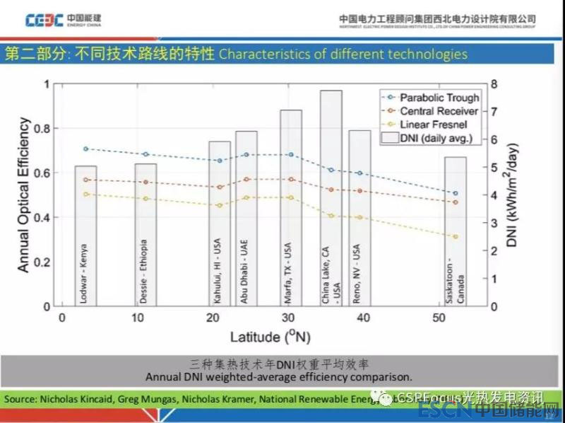 三種集熱技術,考慮年DNI權重后的平均效率在全球范圍內緯度來講,跟剛才分析一致,橫坐標是緯度,縱坐標是年光學效率,對于槽式電站來講,總體來說隨著緯度升高往下降,而北緯36度區(qū)域表現(xiàn)為升高,表明DNI是結合實際DNI,它并不是一個純光學效率,因此結合廠址情況,結論不是絕對的。假如說這個地方一點云都沒有,那么這個曲線肯定是直接往下走的,所以這就提醒我們實際中一定要結合實際的DNI等資源情況,這不是年總DNI那么簡單,而且最好是若干年做的典型太陽年數(shù)據(jù)來分析這個項目的經(jīng)濟性,這個很重要。