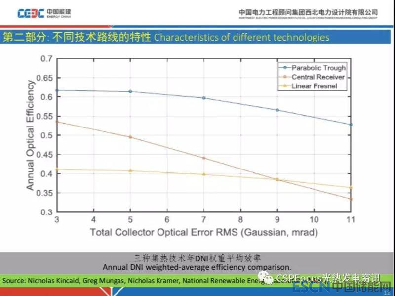 考慮這些因素以后,結合集熱場和定日鏡的誤差,包括跟蹤、反射鏡面型等,就有上面這組曲線。這組曲線藍線是槽式的,下降比較陡的是塔式,最下面的是菲涅爾。隨著誤差的增大,菲涅爾電站的總效率影響比較平緩,槽式次之,塔式最明顯。這就告訴我們,塔式電站定日鏡的設計效率偏離設計值的時候,可能給你的集熱場全年表現(xiàn)帶來非常糟糕的影響。也就是說菲涅爾電站的光學性能容錯能力比較強,通俗講技術難度比較低,現(xiàn)在要搞這個集熱器開發(fā),可能從菲涅爾入手比較簡單。塔式電站屬于精致活,主要是定日鏡,實際表現(xiàn)如果比較差的時候,可能這個電站就比較糟糕了,也有解救措施,大量增加定日鏡,這就要錢了。這個在工程應用中很重要,關鍵設備都要考慮萬一的情況。