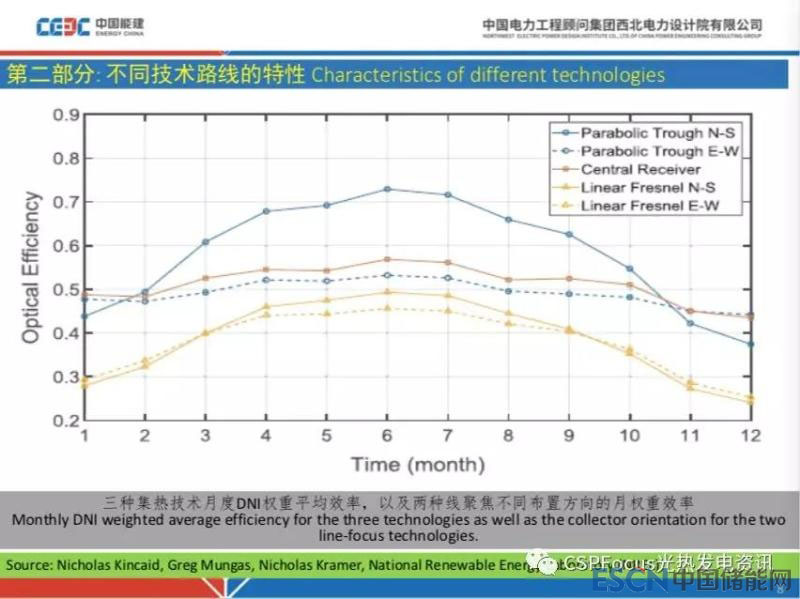 這就告訴我們,在一定緯度區(qū)域,從光學效率環(huán)節(jié)上講槽式電站有一定的優(yōu)勢,請記住,和緯度有一定的關系。槽式電站東西向布置和塔式電站效率表現(xiàn)類似,比較平穩(wěn),表現(xiàn)這兩根線隨月度變化沒有明顯的坡度。